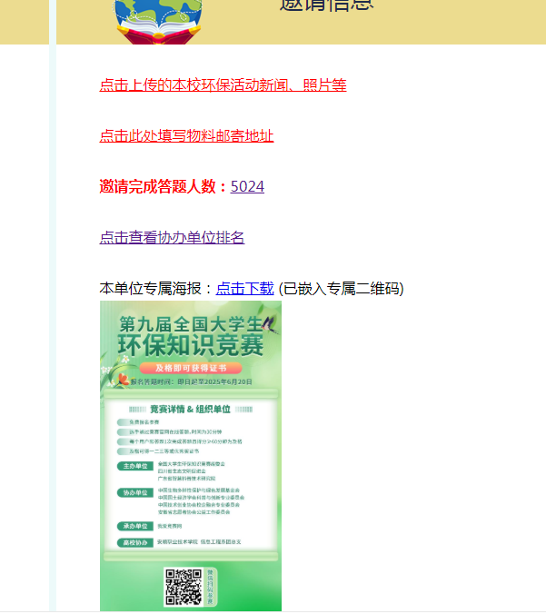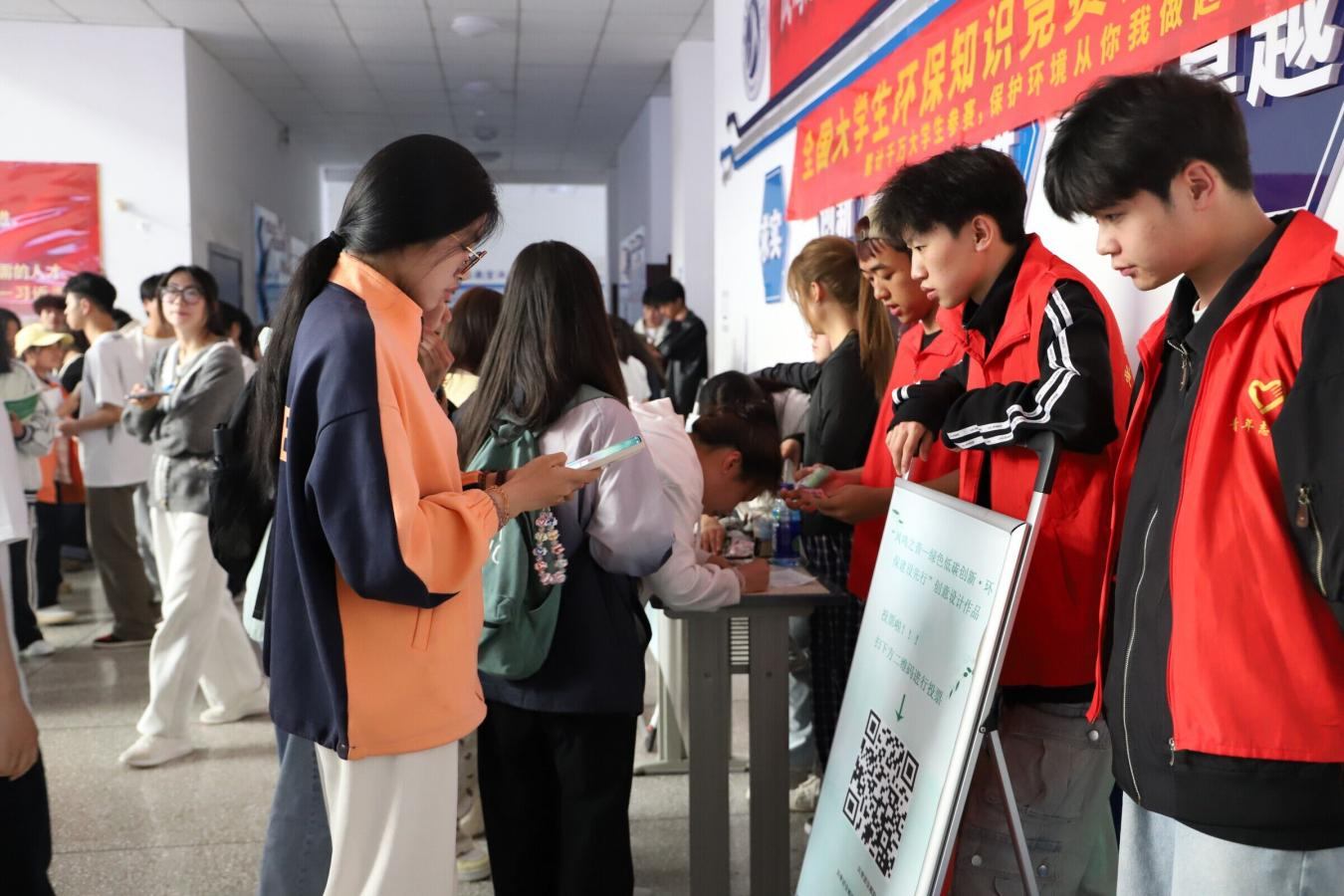 活动分为两大主题单元。“绿色低碳创新·环保建设先行”创意作品设计大赛启动以来,共征集废旧改造、节能装置、环保海报等领域的作品100余件。经初评筛选,55件优秀作品入围决赛,并通过线下投票环节角逐奖项。决赛当天,500余名师生参与现场投票,最终评选出一等奖2名、二等奖4名、三等奖9名。在第二单元第九届全国大学生知识竞赛中,全院5024名学生参与线上答题。竞赛系统围绕减碳降排、垃圾分类等环保知识设置考题,有效强化了学生的生态文明意识。根据答题成绩排名,最终评选出一等奖14名、二等奖21名、三等奖23名。